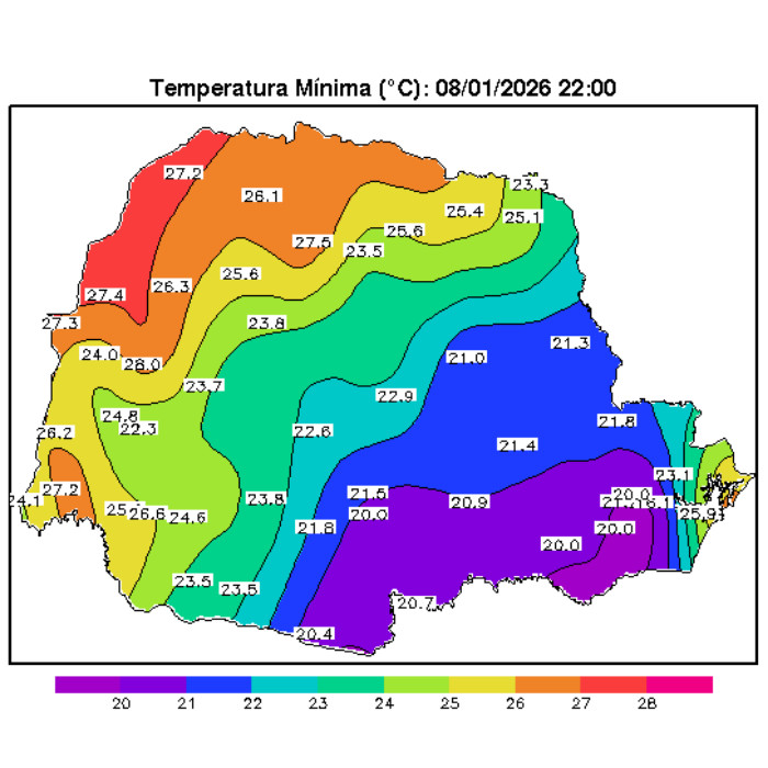 Nesta noite de quinta-feira, até o momento, as temperaturas se encontram acima dos 20 °C em todos os municípios paranaenses. A oferta de calor e umidade proporcionam mais uma noite abafada. No interior, variação de nuvens, especialmente nebulosidade alta (do tipo "cirrus"). Enquanto no Leste, cobertura de nuvens mais densa, com temporais em Guaraqueçaba. Ao longo da madrugada, pancadas de chuva com tovoadas não estão descartadas entre o Norte Pioneiro, Campos Gerais e Leste.