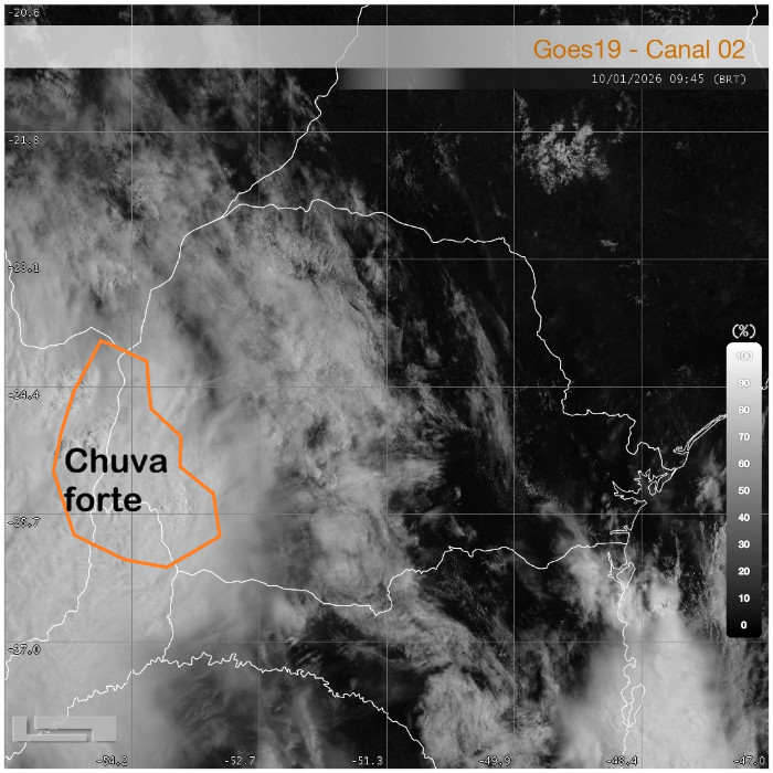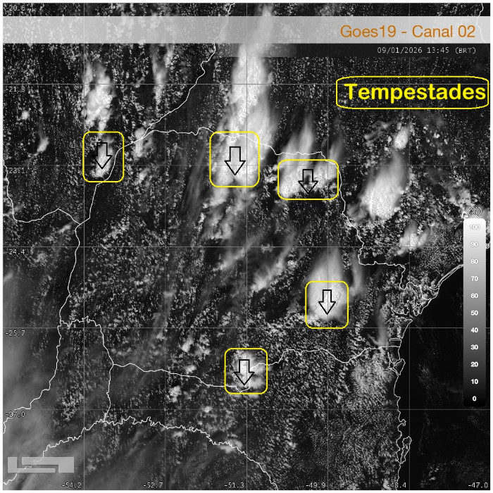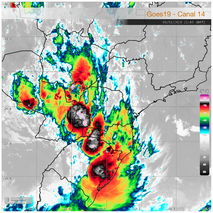 O avanço de uma área de baixa pressão em processo de ciclogênese está favorecendo a intensificação das instabilidades atmosféricas sobre o oeste do Paraná. Tempestades severas, acompanhadas por elevada incidência de descargas elétricas e rajadas de vento intensas, são observadas avançando sobre o estado. Nas imagens de satélite, identificam-se nuvens com tonalidade roxa, indicativas de acentuado desenvolvimento vertical, o que evidencia a persistência dos eventos convectivos intensos durante o início da madrugada.