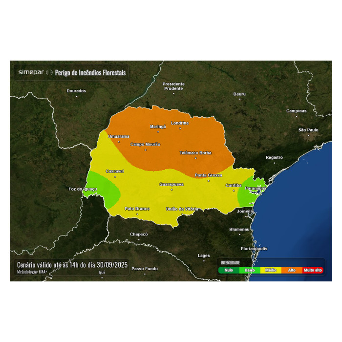 Já a segunda imagem apresenta o risco de incêndios florestais no território paranaense, com previsão válida até as 14h da próxima terça-feira, 30 de setembro.