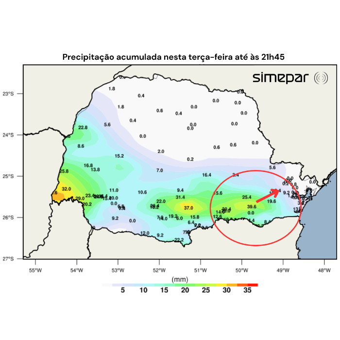 Os acumulados de chuva registrados pelos pluviômetros do INMET e do Simepar, mostrados na imagem a seguir, refletem esse padrão, com volumes registrados entre as regiões Sudoeste e Centro-Sul. O maior acumulado até às 23h foi computado pela estação meteorológica do município de Palmas, com 47,6 mm.
