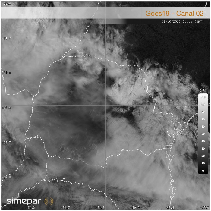 Manhã de muita nebulosidade sobre o Paraná. A chuva concentra-se mais nas porções ao norte do estado, mas com fraca intensidade e de forma localizada. Céu encoberto entre várias cidades do Centro-Sul, Campos Gerias e, principalmente, entre a RMC, Vale do Ribeira, Serra do Mar e o Litoral. Sensação de tempo mais abafado, e até mesmo com predomínio de sol, entre parte do Noroeste e Oeste, pois são nuvens pouco espessas que cobrem essas regiões.