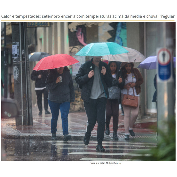Setembro terminou com as condições do tempo características de primavera no Paraná. As temperaturas ficaram acima da média histórica para o período em quase todo o Estado, e metade das estações meteorológicas tiveram volumes de chuva dentro a acima da média, enquanto a outra metade registrou menos chuva do que o valor acumulado histórico para o mês. Leia na íntegra o balanço meteorológico do Simepar.