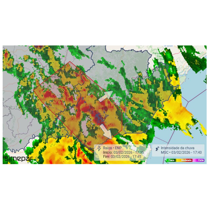 O mês de fevereiro iniciou com volumes elevados de chuva sobre o estado do Paraná, com maior destaque para a região Leste, entre a Região Metropolitana de Curitiba e o Litoral. Nesta terça-feira, a região foi novamente afetada por chuvas volumosas, com episódios de chuva intensa registrados no fim da tarde, resultando em elevados acumulados de precipitação em um curto intervalo de tempo.