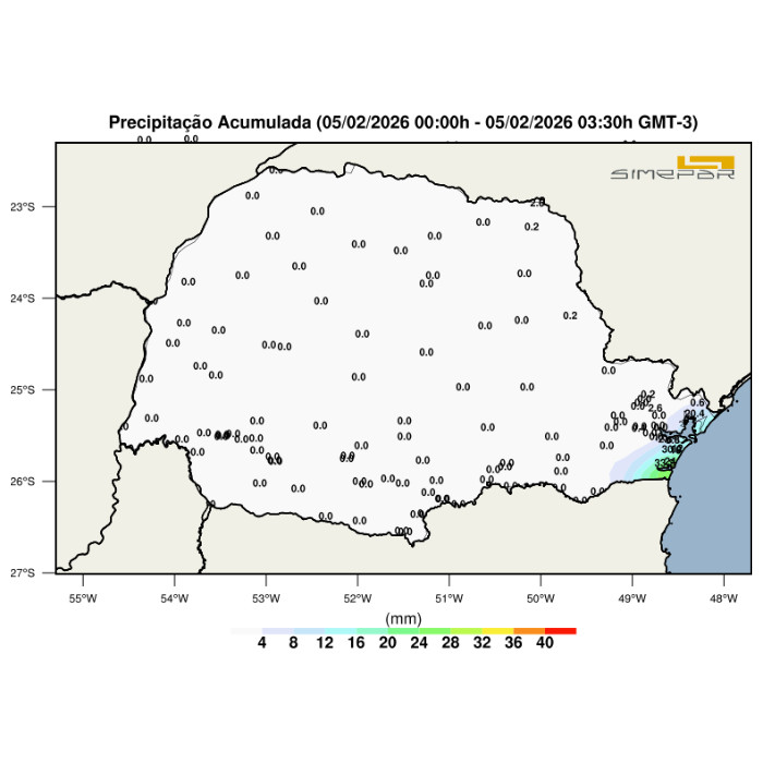 Ainda há ocorrência de pancadas de chuva isoladas, pontualmente com forte intensidade no Leste, porém, até o momento, sem registro de descargas elétricas. A imagem a seguir apresenta os acumulados de chuva sobre o território paranaense, no período entre 12h e 22h45. Observa-se que, no Leste do estado, a precipitação foi mais abrangente. Destacam-se os seguintes acumulados registrados pelos pluviômetros: Morretes, 26,4 mm; Paranaguá, 33,4 mm; Guaraqueçaba, 50,4 mm; e Cerro Azul, 23,0 mm.