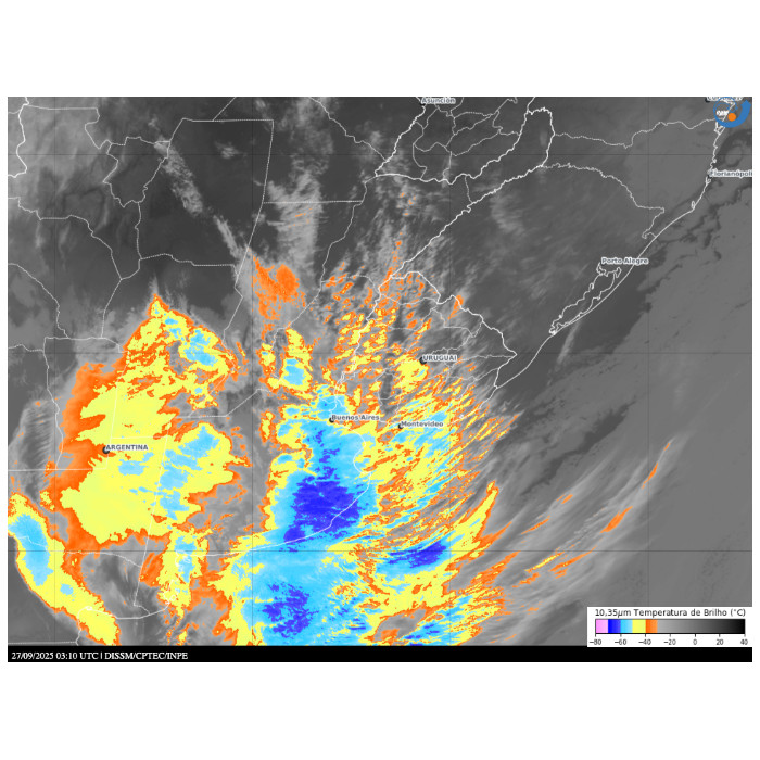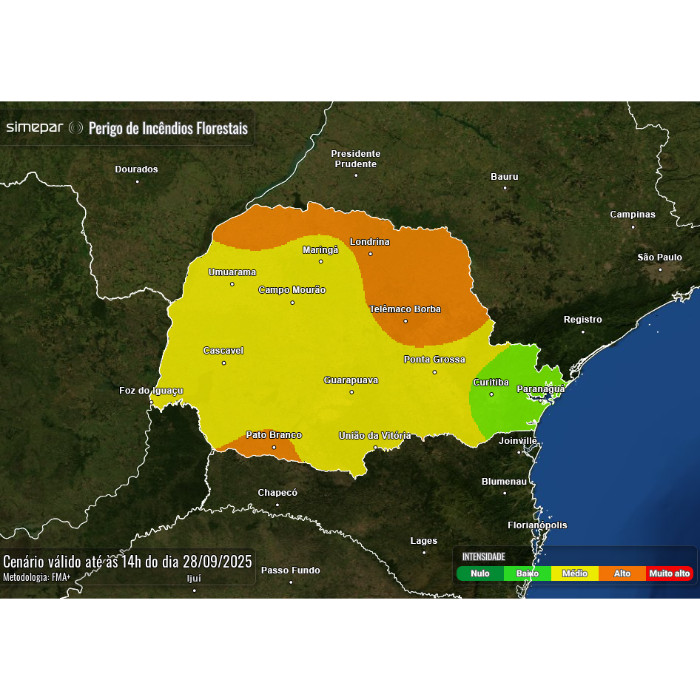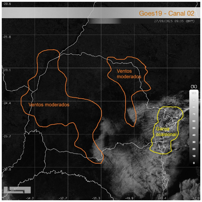 Uma nova frente fria se desenvolve entre o centro da Argentina e o oceano, com aumento de nuvens, pancadas de chuva e muitos raios. Este sistema avança em direção ao estado gaúcho nas próximas horas e chega no Paraná no final da noite deste sábado, através das regiões Oeste, Sudoeste e Sul. Diferente da última frente fria que atingiu o estado paranaense, este sistema apresenta menor intensidade, com risco baixo a moderado de temporais nas diversas regiões. No momento, o céu permanece predominantemente limpo no interior do estado e com muitas nuvens na faixa leste. Os ventos seguem intensos no norte pioneiro, com rajadas de vento ao redor dos 60 km/h em Santo Antônio da Platina.