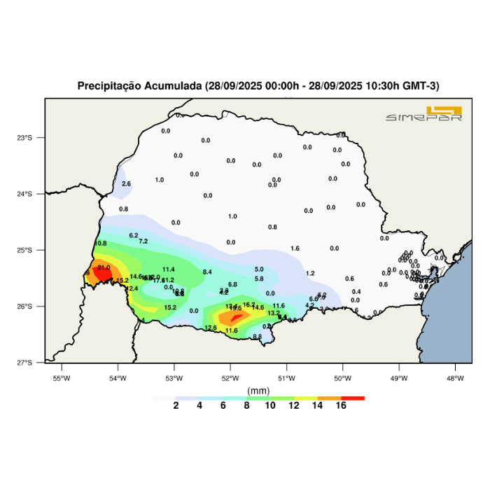 As precipitações seguem atuando sobre o Paraná, com padrão de distribuição desorganizado e gradativa diminuição da intensidade à medida que a área de instabilidade se desloca para o leste do estado. Os maiores acumulados ocorreram no Sudoeste Paranaense durante a madrugada, destacando-se São Miguel do Iguaçu, com 21 mm registrados. Na última atualização do mapa de precipitação, observa-se o deslocamento das chuvas para o Centro-Sul, com maior concentração nas proximidades da região de Palmas, onde foram observados 19,6 mm. Neste momento, a precipitação ainda persiste nesta área.
