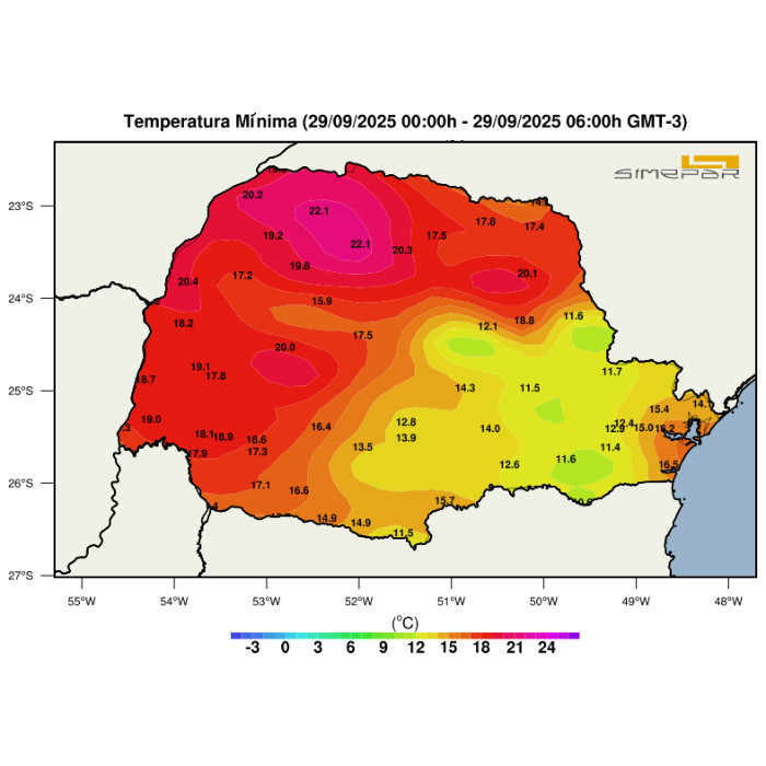 O amanhecer é de tempo estável em todo o estado do Paraná, de tal modo como foi ao longo da madrugada. Após um domingo com instabilidades ocorrendo em praticamente todas as regiões paranaenses, as chuvas se afastaram dando lugar ao Sol que predominou novamente. Sem a presença de uma massa de ar frio robusta, as temperaturas apresentaram redução lenta durante a madrugada, com valores mínimos acima dos 10 °C nas diversas regiões. No sudoeste, centro-sul e sudeste (especialmente na divisa com Santa Catarina) a presença de nuvens baixas e nevoeiros também dificultou maior queda nos termômetros. Até o momento, os menores valores ocorrem em Fazenda Rio Grande (11,4 °C) e Palmas (11,5 °C) no distrito de Horizonte. Em contraste, no noroeste e norte central/novo as mínimas permaneceram acima dos 20 °C.