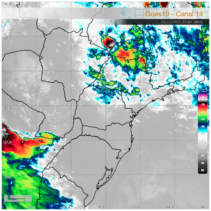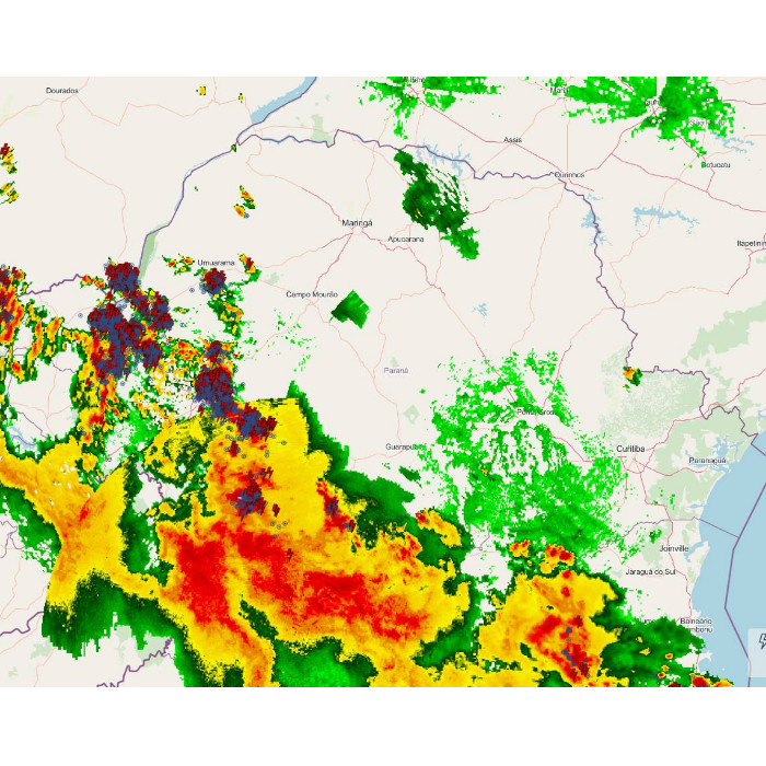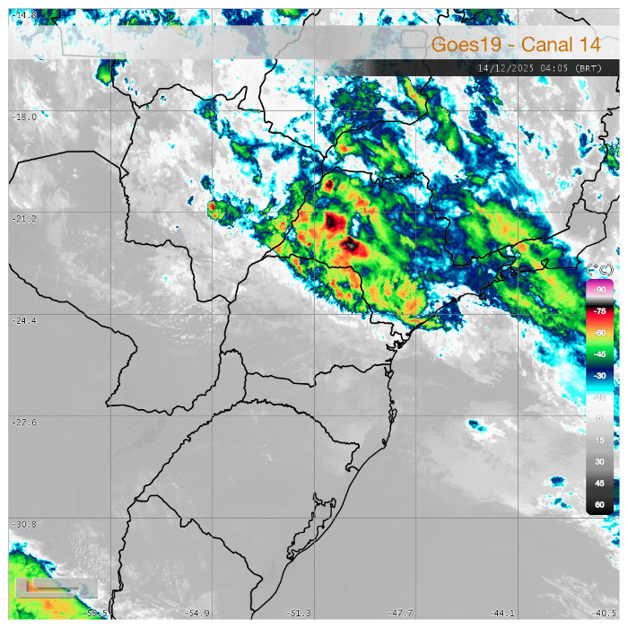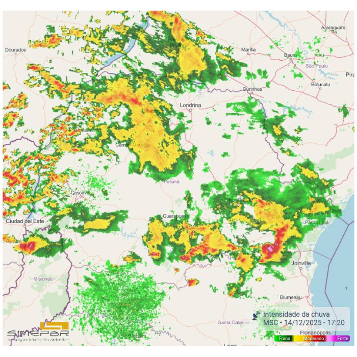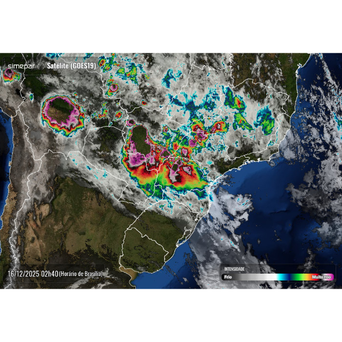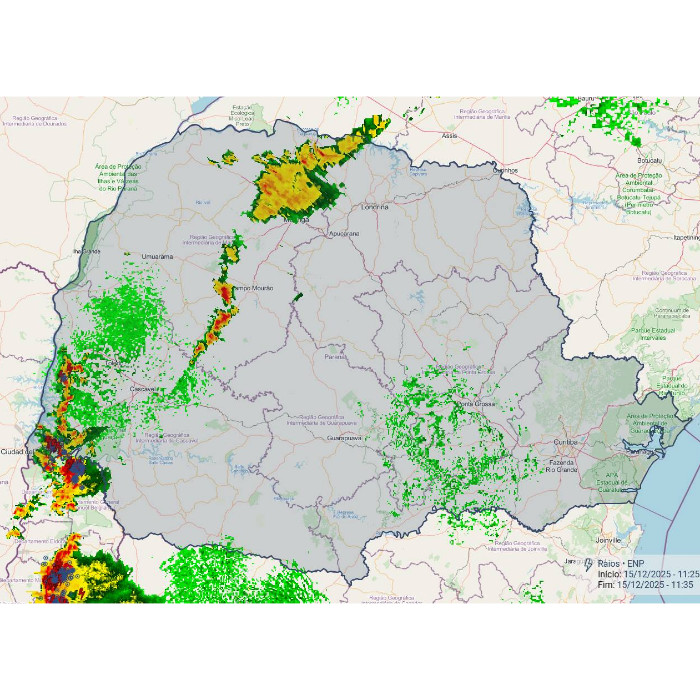 A área de baixa pressão situada entre os países vizinhos e o Sul do Brasil, combinado com o calor e oferta de umidade, mais uma vez favorecem a ocorrência de pancadas de chuva com trovoadas no interior do Paraná. Ao longo da manhã choveu de forma constante, com forte intensidade em alguns momentos, em Paranavaí, acumulando 19,6 mm. No momento, chove ainda na região, até Maringá e Campo Mourão, de forma irregular e, com maior intensidade, na região de São Miguel do Iguaçu com muitos raios. As instabilidades aumentam nas próximas horas e novamente há risco para temporais no estado.