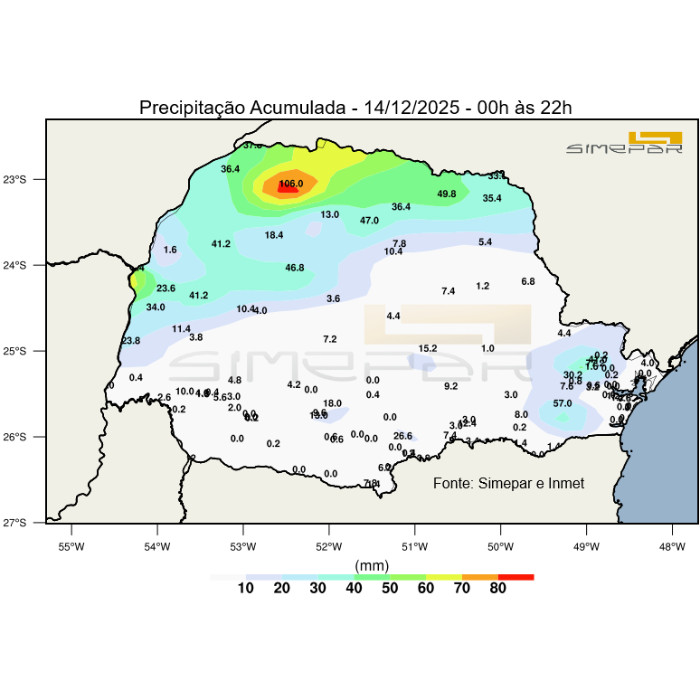 A chuva perde força nesta noite de domingo sobre o estado. Neste momento, há registros de pancadas de chuva isoladas apenas na região Noroeste do estado. Ao longo do dia, foram registradas chuvas nas diversas regiões, com destaque para Paranavaí, que acumula até o momento 106,0 mm, como pode ser observado no mapa da precipitação acumulada até às 22h.