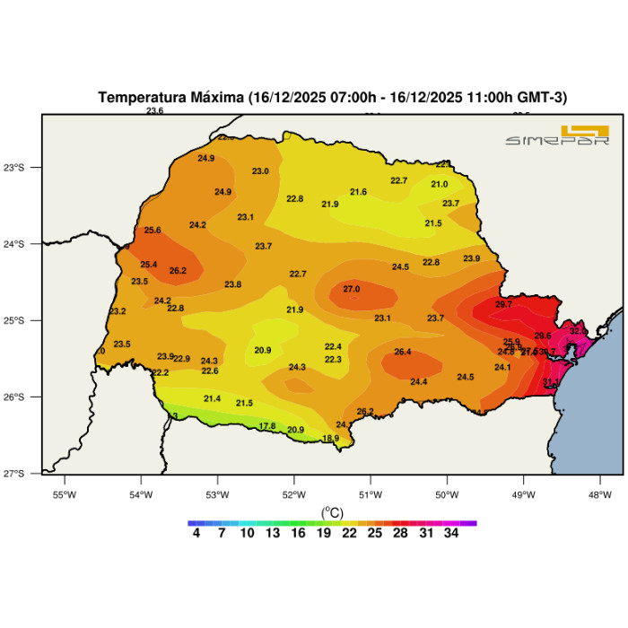 O Sistema Convectivo de Mesoescala (SCM), associado à frente fria que se desloca pelo oceano, já se afastou do Paraná, perdendo sua configuração entre São Paulo e o Mato Grosso do Sul. Neste momento, pancadas de chuva isoladas de fraca intensidade atingem o interior do estado. A sensação de abafamento é marcante na faixa leste (RMC/litoral), com temperaturas já ultrapassando os 30 °C nas praias. A oferta de calor e umidade nestas regiões é combustível para a formação de pancadas de chuva e temporais localizados ao longo da tarde desta terça-feira. Na imagem a seguir, é possível observar a distribuição espacial das temperaturas máximas registradas nesta manhã (até o momento).