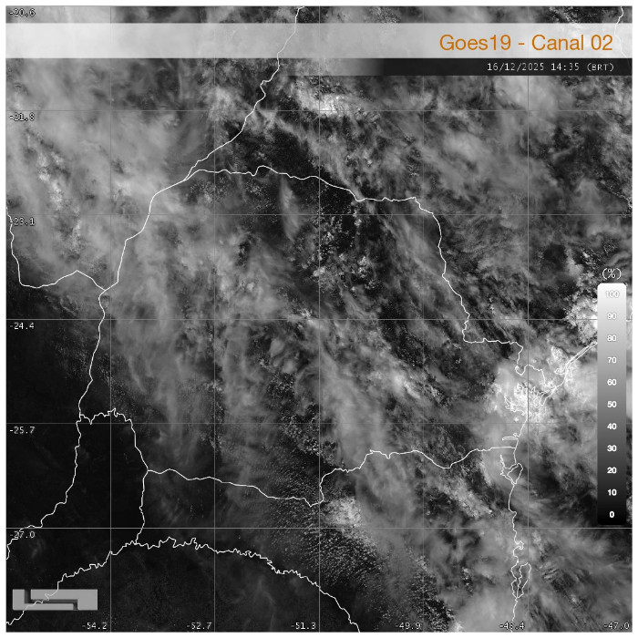 A tarde desta terça-feira é marcada por forte abafamento nas diversas regiões do estado. Com umidade relativa acima de 50% e temperaturas superiores a 25 °C, o índice de calor se eleva, intensificando a sensação de desconforto térmico. Com a frente fria avançando pelo oceano, com seu eixo posicionado entre o Paraná e São Paulo, pancadas de chuva acompanhadas de trovoadas são registradas entre o centro-norte e o centro-leste do Paraná, desde a região de Querência do Norte até o litoral, com deslocamento para nordeste. Nas próximas horas, as instabilidades se afastam em direção ao estado de São Paulo, enquanto a nebulosidade tende a aumentar no litoral paranaense, devido ao transporte de umidade do oceano para o continente.