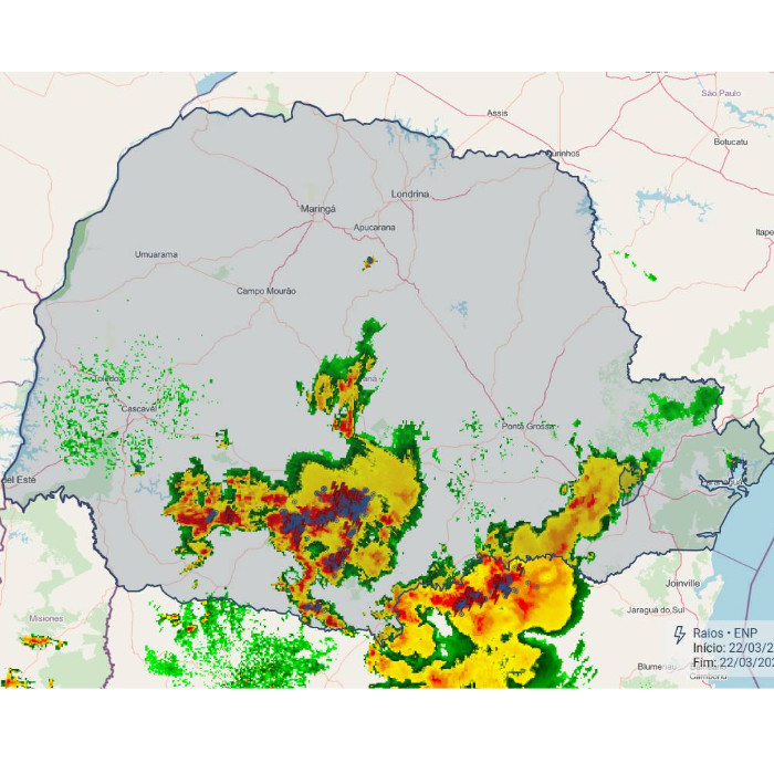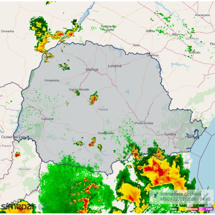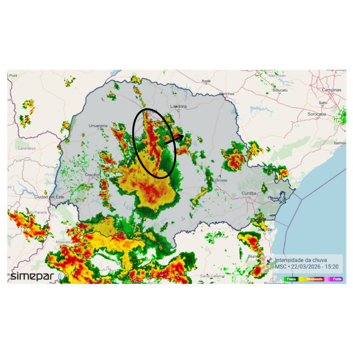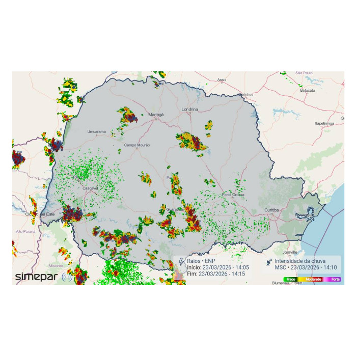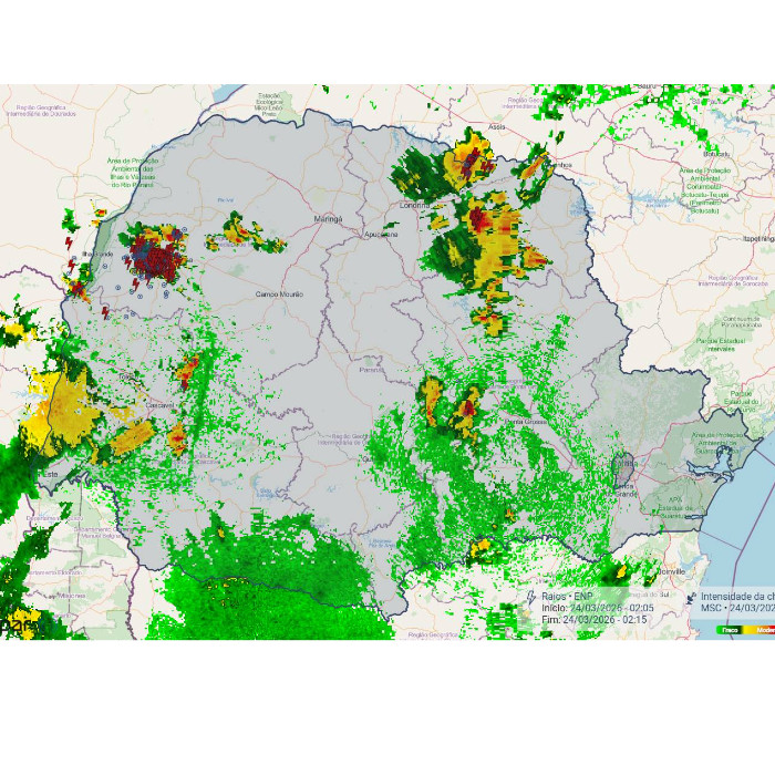 Também foram registrados volumes elevados em Laranjeiras do Sul (30,6 mm) e Jaguariaíva (29,6 mm). Outras localidades apresentaram acumulados relevantes, como Cerro Azul (25 mm), Maringá (24,6 mm), Palmas (20,6 mm) e Palmital – Santa Maria (19,4 mm). Já em Entre Rios (16,6 mm), Foz do Chopim (15,8 mm) e União da Vitória (10,4 mm), os volumes foram mais moderados.