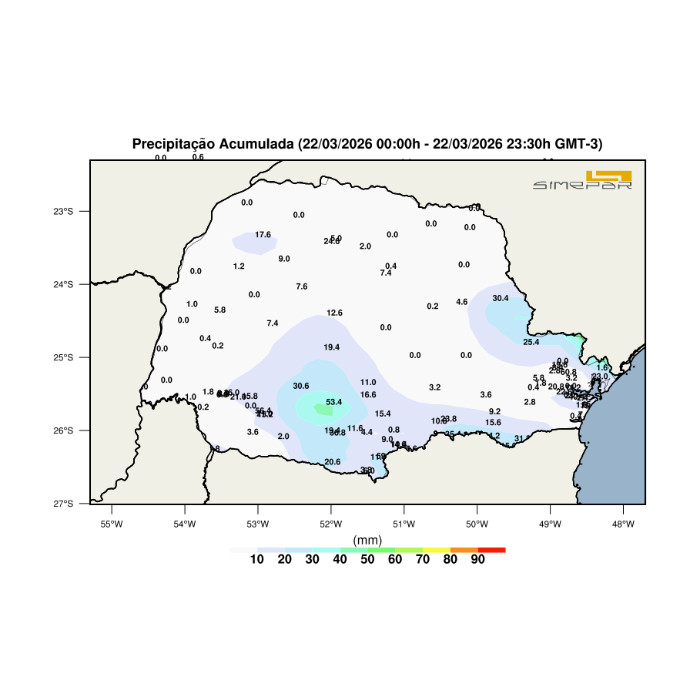 De acordo com o mapa de precipitação acumulada, os maiores volumes se concentraram principalmente entre as regiões Centro-Sul e Sul paranaense. Com base nos dados das estações meteorológicas do Simepar, destacam-se os acumulados em Pinhão (53,4 mm) e Antonina, no Litoral, com 60,8 mm ao longo do dia.