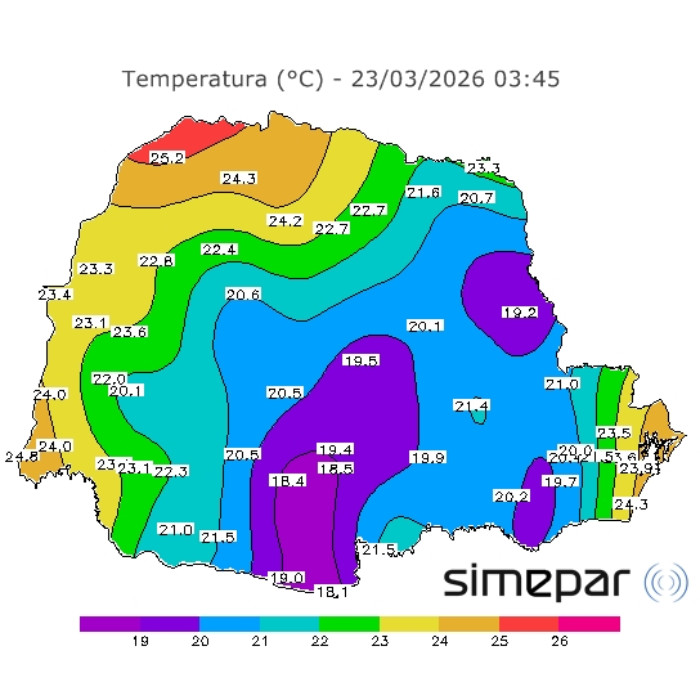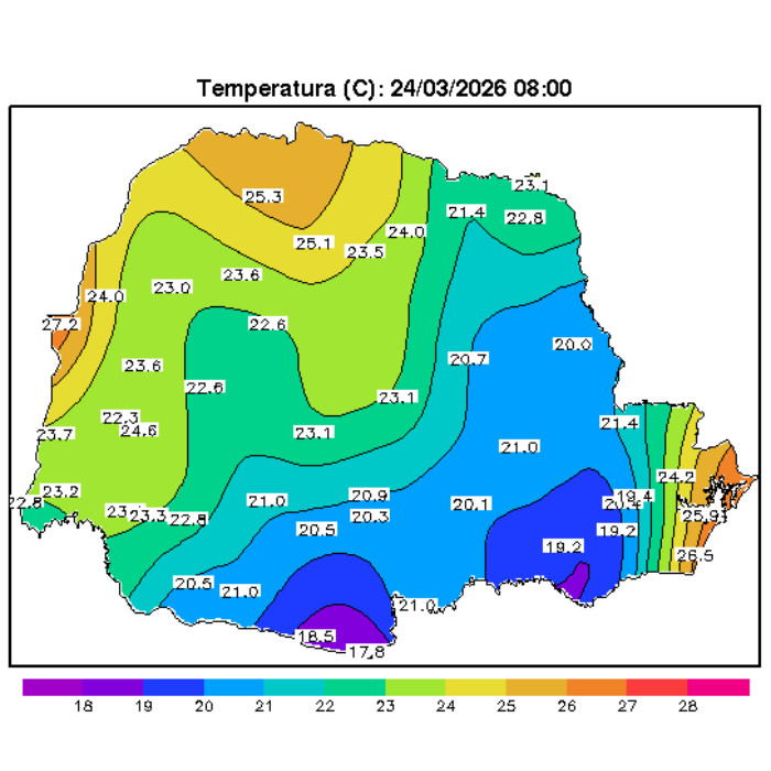 As menores temperaturas concentram-se entre as regiões Sudeste, Campos Gerais e a Região Metropolitana de Curitiba, mas ainda assim variam entre 25 °C e 30 °C.