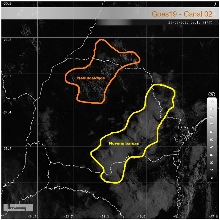 Amanheceu sem registro de chuvas no Paraná, mas com presença de nebulosidade entre o Noroeste e o Norte do estado. Nos Campos Gerais e no Centro-Sul há presença de nuvens baixas e/ou nevoeiros. Na imagem de satélite em anexo observa-se a distribuição das nuvens. Temperaturas mínimas ficaram ligeiramente abaixo dos 20°C no Sudoeste, Centro-Sul, Campos Gerais e RMC.
