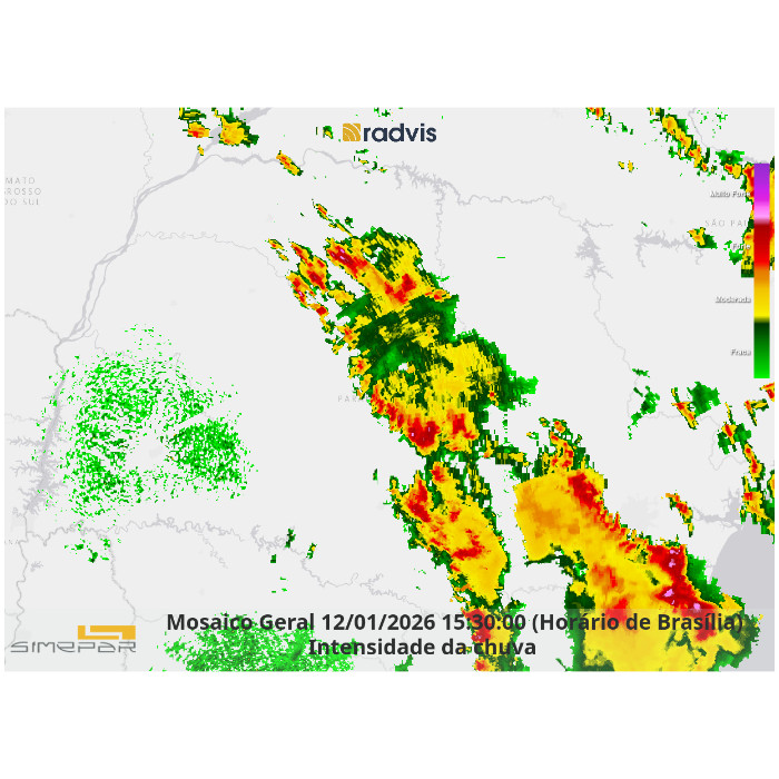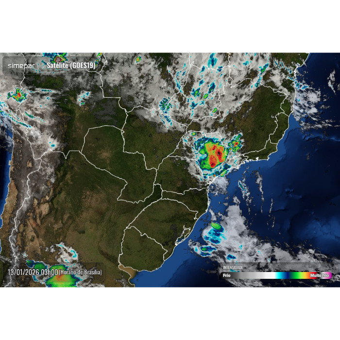 Em mais um dia com forte instabilidade no estado, as tempestades atingem a faixa centro-norte e principalmente centro-leste. Há registro de chuva intensa com muitos raios e potencial para queda de granizo acompanhada de rajadas de vento nas proximidades de Tamarana, Marialva, Mandaguari, Floresta, Guaratuba, Curitiba, Irati e Ivaí. Nas próximas horas a tendência é que as instabilidades persistam nessas regiões, com deslocamento para a faixa leste, onde chove até a noite. Quanto às temperaturas, calor mais expressivo no litoral e elevação das temperaturas também no noroeste, acima dos 30 °C.