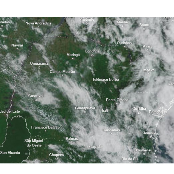 Manhã com presença de muitas nuvens entre o Sul e o Leste do estado, mas com o sol aparecendo em alguns momentos. Ente a Serra do Mar e as praias, há registros de chuviscos ocasionais. Nas demais regiões, o sol predomina entre poucas nuvens elevando as temperaturas. Entre o oeste e noroeste, os termômetros variam entre 26 e 27 ºC, no litoral 25 ºC e em Curitiba 22 ºC. A imagem do satélite, mostra a presença da nebulosidade sobre as regiões paranaenses.