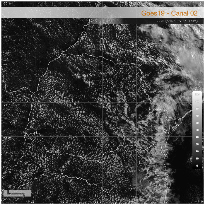 A tarde desta quinta-feira é de tempo predominantemente estável no Paraná. As temperaturas máximas ficam mais elevadas na faixa Oeste e Noroeste do estado, onde o aquecimento ocorre de forma mais eficiente ao longo do dia. No Leste do Paraná, incluindo a Região Metropolitana de Curitiba e o litoral, as temperaturas permanecem mais amenas. Esse comportamento está associado à incursão de ventos marítimos, que favorecem maior presença de nebulosidade e limitam a elevação das temperaturas. A imagem de satélite do canal visível desta tarde evidencia nebulosidade mais densa sobre o Leste, enquanto no interior do estado predomina mais o céu aberto, com as famosas 'cumulus de bom tempo', o que explica o contraste térmico observado entre as regiões.