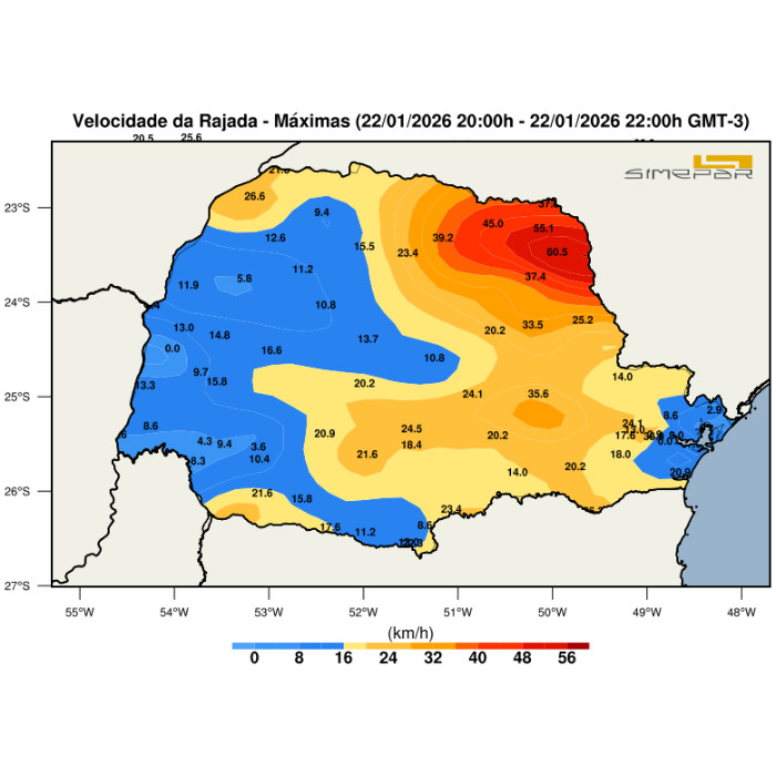 A pista de ventos formada entre o sistema de alta pressão situado na altura do Uruguai e a área de baixa pressão entre o Sudeste e o Sul do Brasil, ambos no oceano, favorece ventos persistentes do centro ao sul, norte e leste do Paraná. nesse cenário, a sensação de frio aumenta, uma vez que municípios como Guarapuava, Palmas, Lapa, Curitiba e Ventania registram temperaturas ao redor dos 14 °C neta noite. Com a descida do segundo Planalto (de Ponta Grossa), na região do Norte Pioneiro, os ventos canalizam no relevo e aceleram, provocando rajadas mais fortes na altura de Santo Antônio da Platina e Joaquim Távora. No momento, os municípios registram 55,1 km/h e 60,5 km/h, respectivamente.