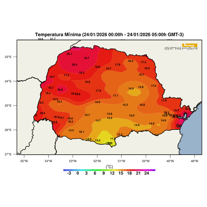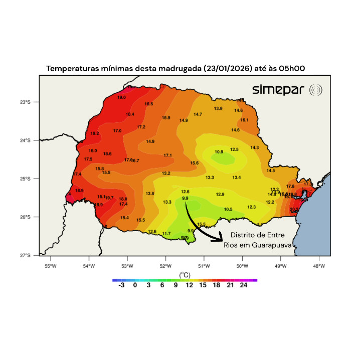 Mais um amanhecer gelado entre as regiões Centro-Sul, Sudeste, Campos Gerais e RMC, com maior cobertura de nuvens, enquanto nas demais áreas do estado predominou condição de céu aberto. Através da imagem a seguir, observa-se os menores registros de temperatura, coletados pelas estações meteorológicas distribuídas pelo território paranaense ao longo da madrugada. Destaca-se a estação de Guarapuava, localizada no distrito de Entre Rios, que registrou 9,9 °C — a menor temperatura para o mês de janeiro desde o início das medições na localidade, em 2001. Valores ligeiramente inferiores a 10 °C também foram registrados em Palmas (9,7 °C) e General Carneiro (9,9 °C). Já nas faixas oeste e litorânea, as temperaturas permaneceram superiores aos 16 °C.