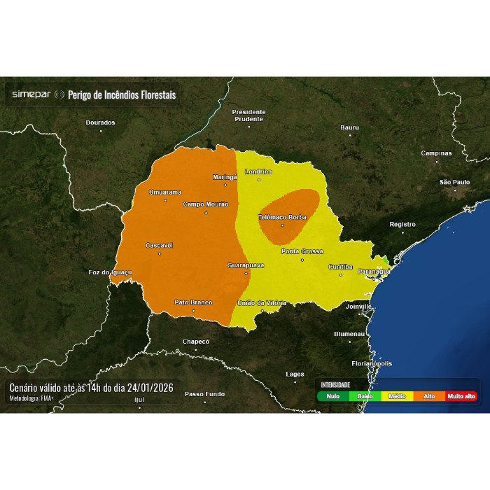 Observa-se, nos últimos dias, a elevação do risco de incêndios florestais em áreas do interior do Paraná, especialmente nas regiões Oeste, Noroeste e parte do Centro-Sul. Esse cenário está associado aos baixos valores de umidade relativa do ar, que permanecem abaixo de 40% em vários municípios durante as horas mais quentes do dia, favorecidos pela atuação de ar mais seco e estável. Nessas condições, a vegetação fica mais suscetível à propagação do fogo, exigindo atenção redobrada e a adoção de medidas preventivas.