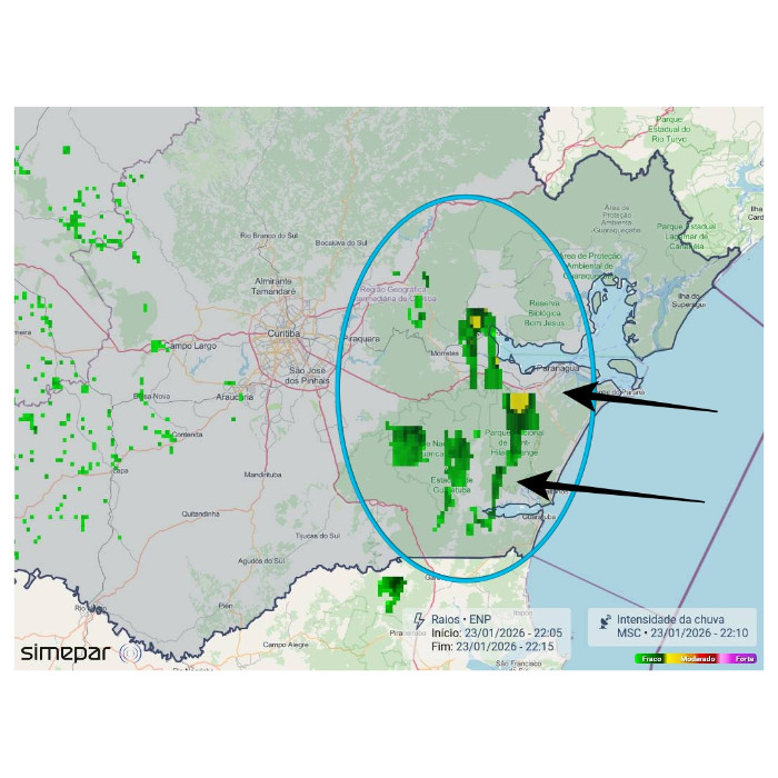 A diferença de temperatura e pressão entre continente e oceano favorece instrusão de umidade sobre o Paraná, com os ventos de leste/sudeste. Essa umidade auxilia na formação de nuvens e pancadas de chuva na faixa leste do estado, especialmente entre a Serra do Mar e as praias. Na RMC, chuviscos são esperados ao longo desta noite e madrugada. As temperaturas baixas são novamente destaque na RMC, Sudeste e Centro-Sul, com valores entre 15 °C e 17 °C no geral. Quanto aos ventos, persistem com moderada intensidade no Norte Pioneiro, intensificando nas próximas horas.