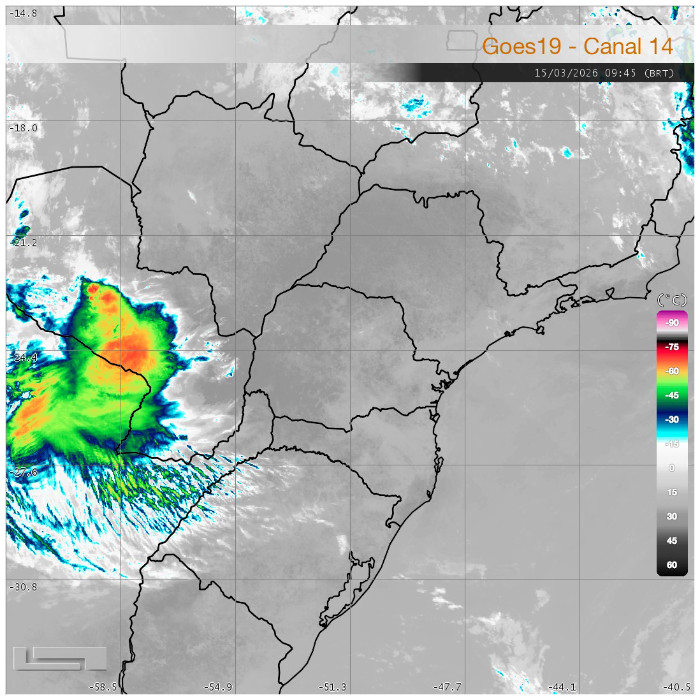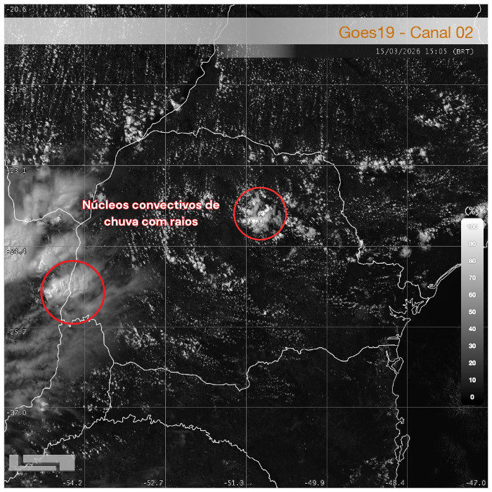 Na imagem de satélite do GOES-19, observa-se o predomínio de sol em grande parte do estado, acompanhado pela formação de nuvens inicialmente associadas ao bom tempo (Cumulus humilis). No entanto, ao longo do período, essas nuvens têm se desenvolvido em algumas localidades, favorecendo a ocorrência de pancadas de chuva acompanhadas de raios. Na imagem, destacam-se os núcleos convectivos mais intensos até o momento.