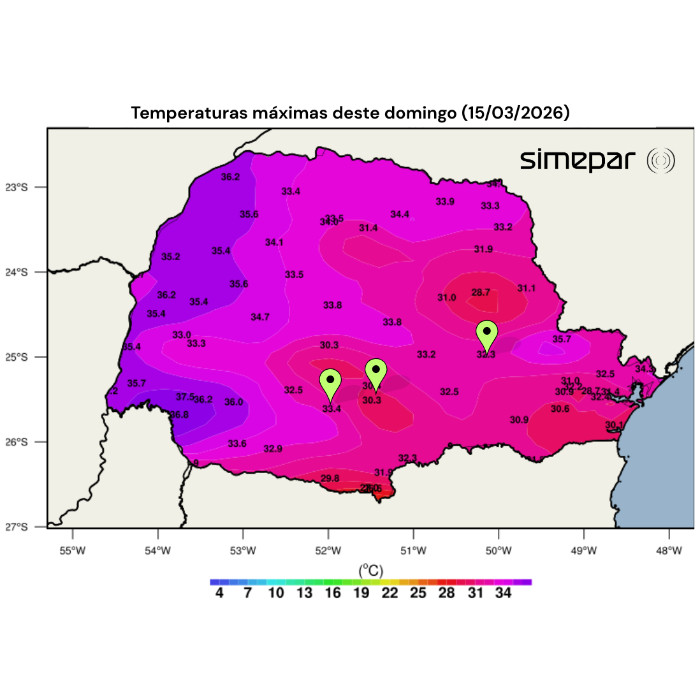 Domingo de muito calor em todo o Paraná. Em todas as regiões do estado, as temperaturas já ultrapassaram os 30 °C. Na faixa oeste, especialmente em municípios próximos à divisa com o Mato Grosso do Sul e na fronteira com Paraguai e Argentina, os termômetros já superaram os 35 °C.