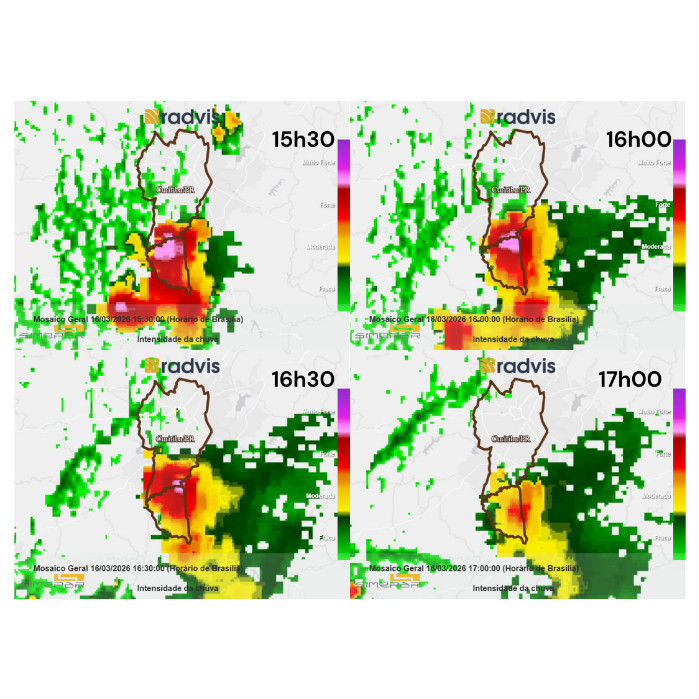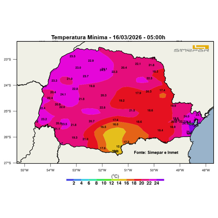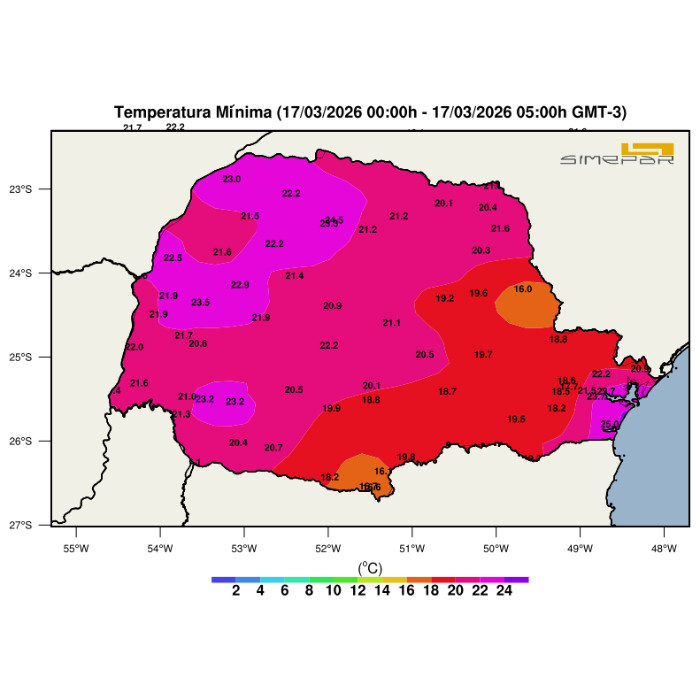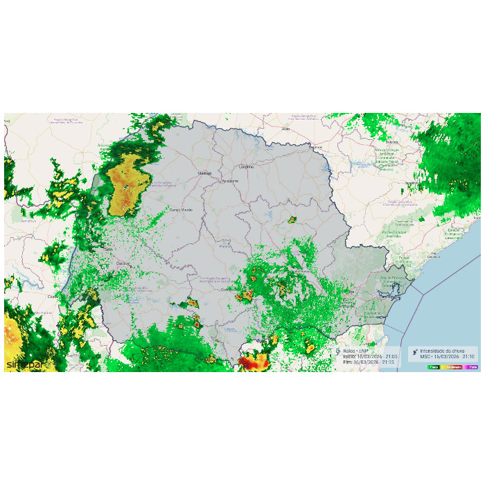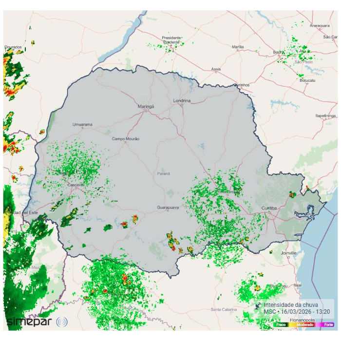 Devido à presença de um sistema de baixa pressão sobre países vizinhos, a instabilidade atmosférica encontra-se mais elevada no setor oeste do estado. Neste momento, inclusive, uma tempestade isolada avança sobre o município de Foz do Iguaçu, onde já foi registrada rajada de vento de 73,8 km/h.