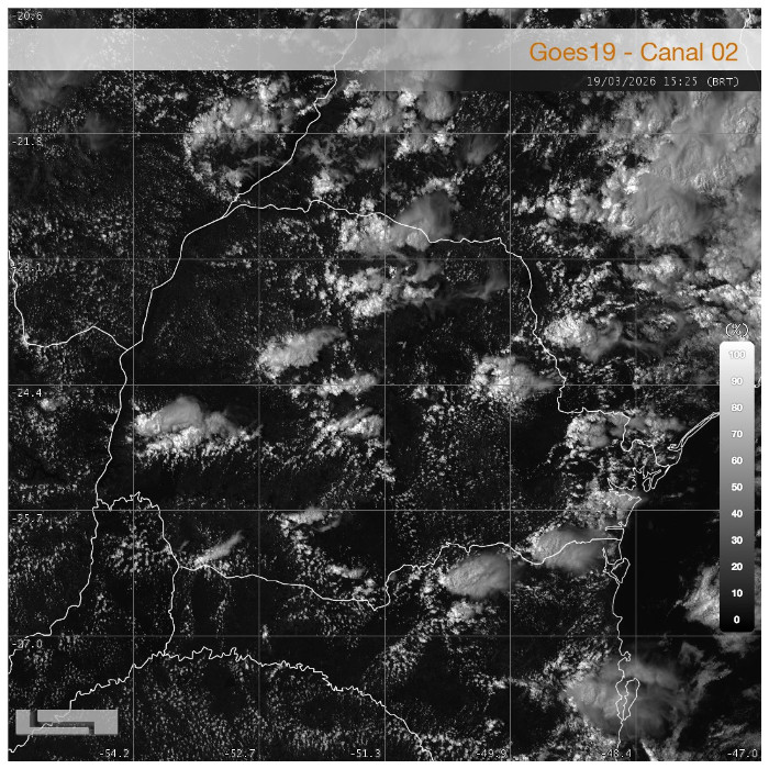 Durante o período da manhã, este escoamento pôde ser identificado nas imagens do satélite GOES-19, especialmente no canal do visível. A evidência desse processo apareceu na forma de ruas de cumulus — alinhamentos organizados de nuvens cumulus — que se dispõem paralelamente à direção do vento, evidenciando a presença de um escoamento intenso e bem definido nos baixos níveis da atmosfera.