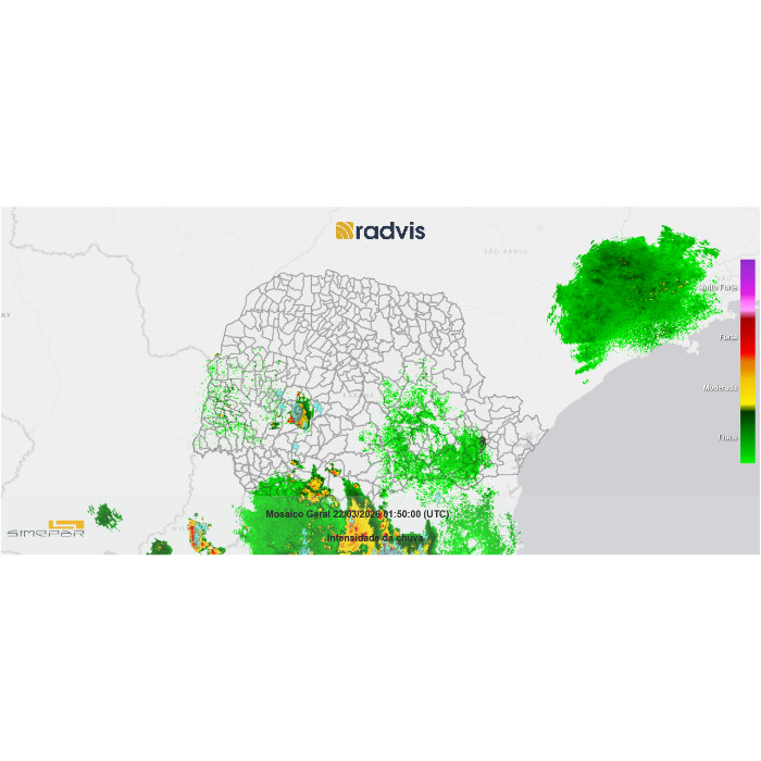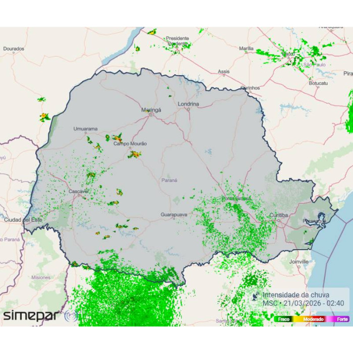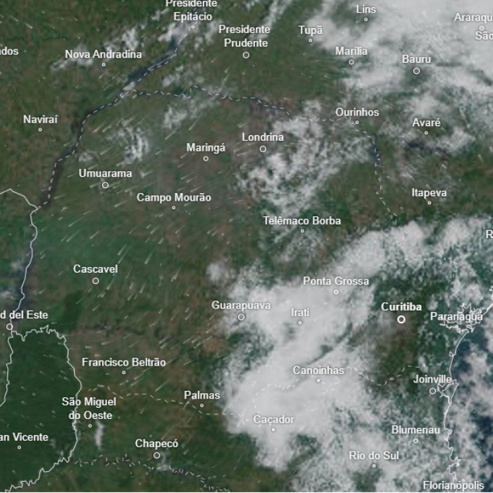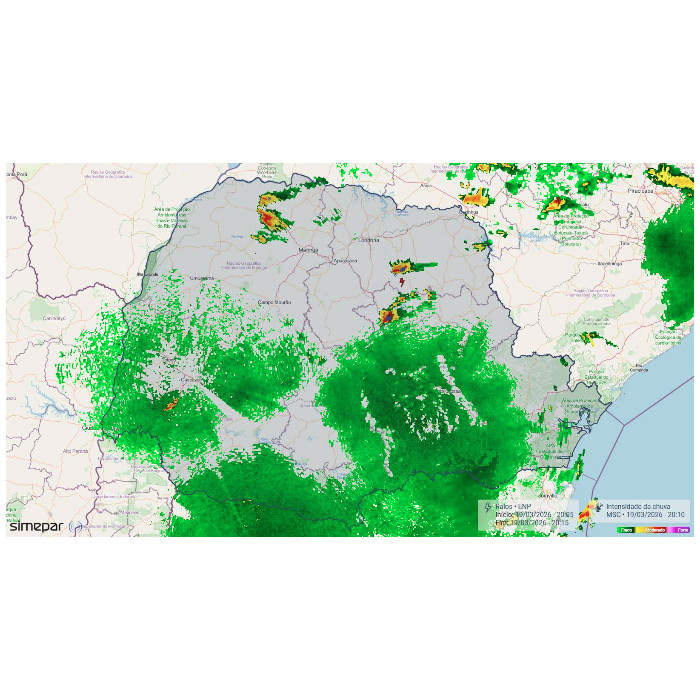 Neste momento, a imagem de radar indica chuva atuando de forma irregular sobre o Paraná. No momento, há núcleos de precipitação mais intensos entre as regiões Oeste e Centro-Sul do estado. Nas demais regiões, não há registro significativo de precipitação. As instabilidades mais organizadas concentram-se ao sul do estado, avançando a partir do Rio Grande do Sul e Santa Catarina, o que mantém o tempo instável nas próximas horas, com possibilidade de pancadas de chuva localmente mais intensas, acompanhadas de descargas atmosféricas.