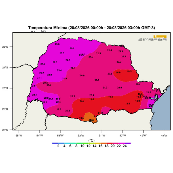 O verão se despede com temperaturas mínimas elevadas em grande parte do Paraná, com valores predominantemente acima dos 20°C. As menores temperaturas concentram-se no sul do estado, onde os termômetros registram valores próximos a 17°C, enquanto nas demais regiões as mínimas variam entre 19°C e 24°C.
