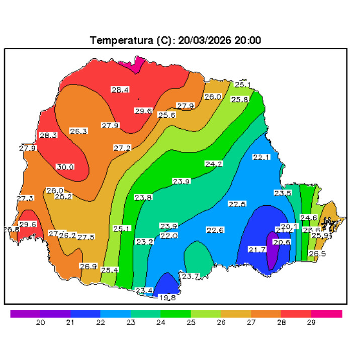 Noite de sexta-feira com precipitação apenas em parte do litoral. Na maior parte do interior do estado há presença de pouca nebulosidade, após uma tarde de muito calor. Temperaturas superaram os 34°C em várias cidades do Noroeste, Oeste e Sudoeste. As estações meteorológicas de Palmas (31,5°C) e Pinhão (33,7°C), do Simepar, e a de Ivaí (33,9°C), do INMET, registraram hoje suas temperaturas mais altas de 2026 até o momento. No mapa em anexo as temperaturas das 20 h no Paraná.