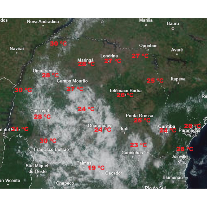 Entre a madrugada e o começo da manhã, foram registrados alguns núcleos isolados de chuva entre as regiões Noroeste, Oeste, Sudoeste e Centro-Sul. Neste momento, tempo estável com sol predominando nas diversas regiões paranaenses. Entre as regiões Oeste, Sudoeste e Centro-Sul, o sol aparece entre nuvens. No Oeste, os termômetros já ultrapassam os 30 ºC neste momento. Na imagem do satélite, observa-se a presença da nebulosidade e as temperaturas máximas registradas às 10h pelas redes de estações meteorológicas do Simepar e Inmet.