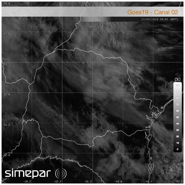 A imagem indica que o estado do Paraná apresenta cobertura de nuvens irregular neste momento. Observa-se maior concentração de nebulosidade sobre as regiões centro-sul e leste do estado. Na faixa litorânea e na Região Metropolitana de Curitiba, há presença de nebulosidade mais organizada, associada à circulação marítima. Por outro lado, o norte e o noroeste paranaense apresentam menor cobertura de nuvens, com predomínio de céu aberto e estabilidade atmosférica, favorecendo a elevação das temperaturas.