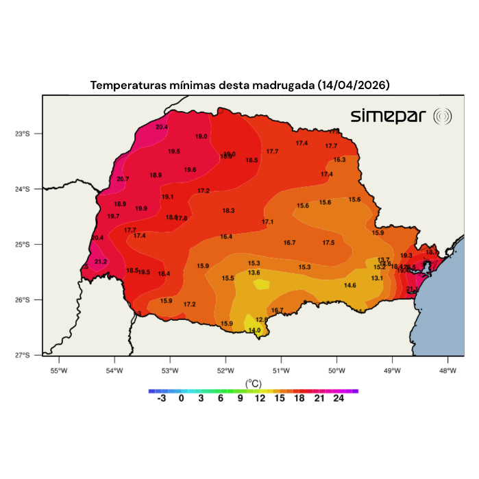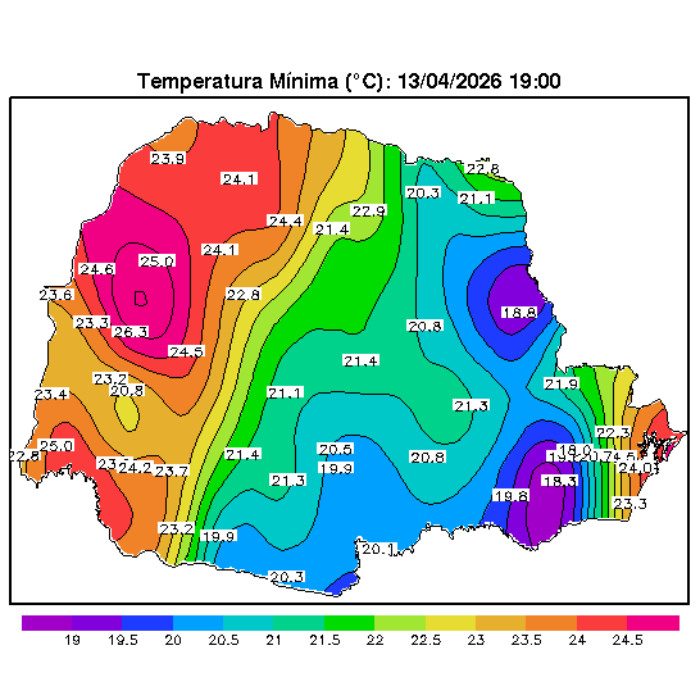 A distribuição das temperaturas mínimas desta madrugada está apresentada na imagem a seguir. As mínimas ficaram, em geral, entre 13 °C e 15 °C (cores em tons de amarelo e laranja claro). Já nos municípios litorâneos e na faixa oeste do estado, elas permaneceram próximas ou ligeiramente acima dos 20 °C.