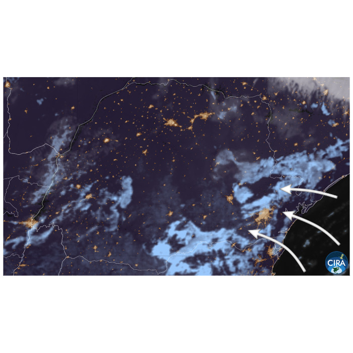 Ao longo da madrugada, a infiltração da circulação marítima para o interior do Paraná aumentou gradativamente a cobertura de nuvens baixas nas regiões Leste, Sudeste e Centro-Sul. Em contrapartida, a nebulosidade média presente na faixa oeste deslocou-se em direção ao nordeste, ao mesmo tempo em que se dissipava.