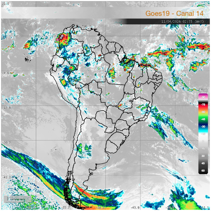 Neste momento, a imagem de satélite do canal infravermelho indica predomínio de tempo estável sobre o Paraná, com pouca nebulosidade atuando no estado e ausência de áreas de instabilidade organizadas. Os núcleos convectivos mais intensos concentram-se sobre o centro-norte do país e também no oceano, afastados da região. Assim, o tempo segue firme em todo o estado, sem condição para chuva neste momento