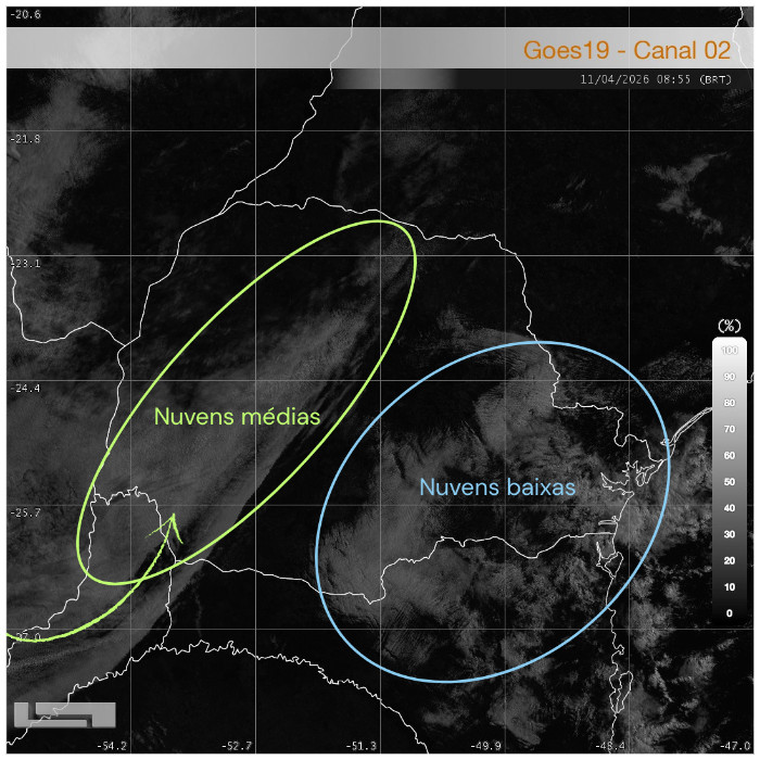 Já nos setores mais a noroeste do estado, o dia também iniciou com nebulosidade significativa, associada a nuvens médias (elipse verde). A trajetória dessa nebulosidade em médios níveis é indicada pela seta verde. Esta condição ocorreu devido à formação de um sistema de baixa pressão originado entre os países vizinhos — Paraguai e norte da Argentina — que está se aprofundando em direção ao Sul do Brasil.