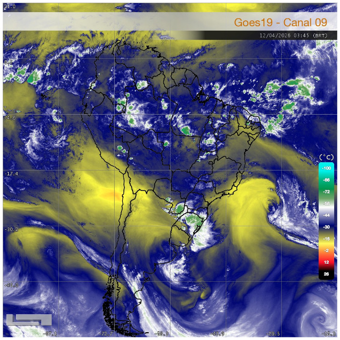 Neste momento, a imagem de satélite do canal de vapor d’água evidencia maior concentração de umidade sobre o Sul do Brasil, com destaque para o Rio Grande do Sul, onde se observam áreas mais organizadas de nebulosidade associadas a um sistema de baixa pressão atuando sobre países vizinhos. No Paraná, por enquanto, o tempo permanece estável. Pancadas de chuva isoladas começam a se formar pelo Sudoeste. A tendência, nas próximas horas, é de avanço dessas instabilidades de sudoeste para nordeste, ao longo deste domingo, favorecendo o retorno gradual das chuvas ao estado.
