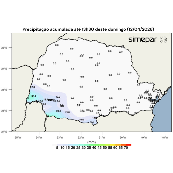 A imagem a seguir exibe a distribuição de temperaturas no Paraná neste início de tarde. Observa-se que, nas áreas onde houve maior concentração de nebulosidade baixa durante a manhã, em geral, as temperaturas permanecem inferiores a 25 °C (cores em tons de amarelo e laranja claro), com o menor registro na estação meteorológica de General Carneiro, que marcou 17,4 °C.