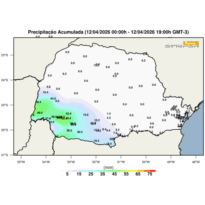 Com o deslocamento de sistemas meteorológicos em direção ao Paraná, os índices de instabilidade se elevaram condicionando o ambiente para formação de chuvas e temporais no Sudoeste, Oeste e Noroeste do estado. A chuva persistente, desde o período da manhã, traz acumulados acima dos 40 mm em municípios como: Candói (41,0 mm), Francisco Beltrão (41,8 mm), Quedas do Iguaçu (42,4 mm), Foz do Iguaçu (44,6 mm), São Miguel do Iguaçu (49,0 mm), Cruzeiro do Iguaçu (49,4 mm), Santa Helena (49,4 mm), Toledo (61,0 mm) e Ouro Verde do Oeste (76,8 mm). No momento, fortes tempestades atingem a região entre Douradina, Tapira e Nova Olímpia, com elevado risco para queda de granizo e ventos fortes. Fique atento aos alertas da Defesa Civil! Os temporais seguem nas próximas horas no Oeste e Noroeste paranaense, se estendendo de forma irregular ao Norte Central.