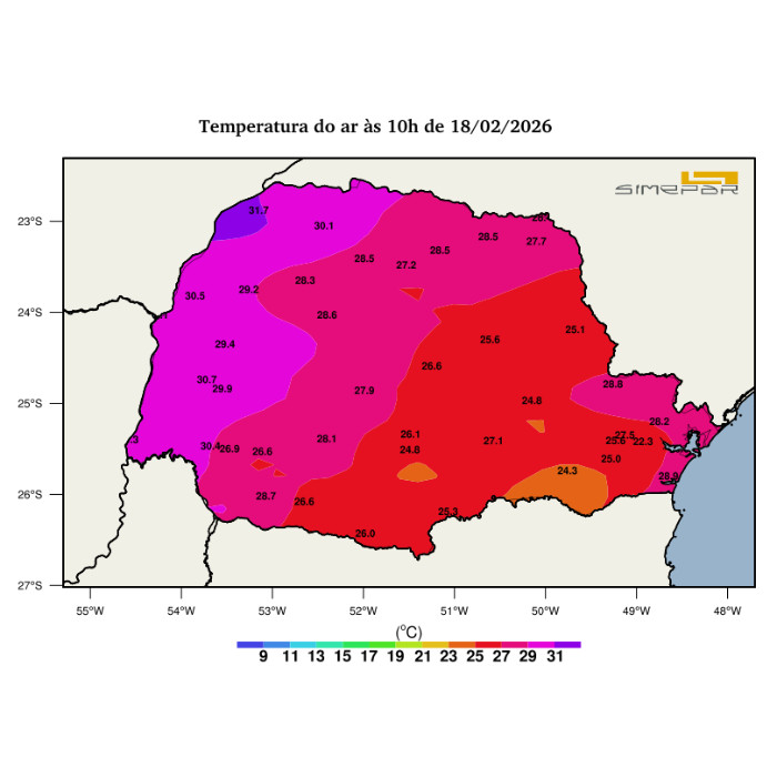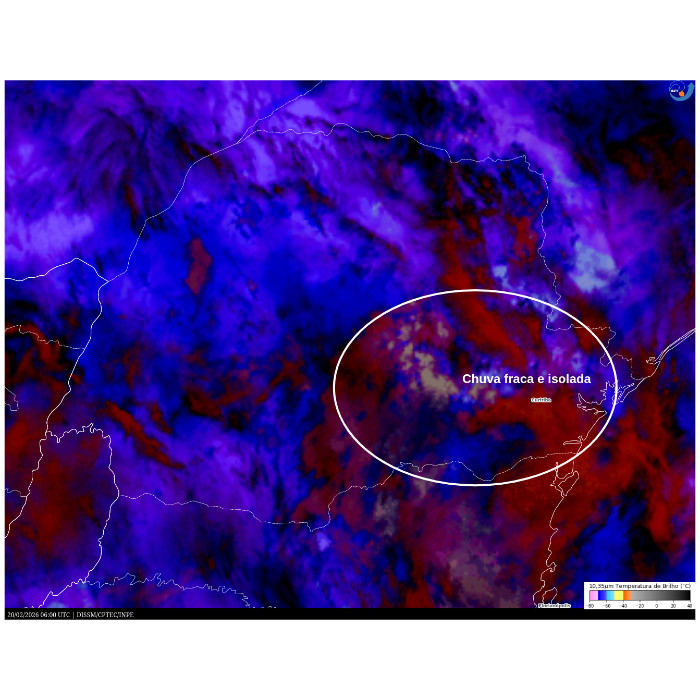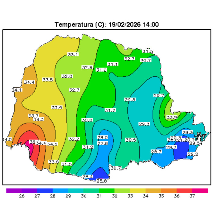 A circulação marítima ainda deve manter a ocorrência de chuvas isoladas no litoral nas próximas horas, mas o Sol deve predominar de tal modo como no interior, favorecendo a elevação das temperaturas. Pancadas de chuva e temporais isolados não estão descartados ao longo do dia, principalmente no Oeste e Sudoeste, onde as temperaturas disparam e se aproximam dos 40 °C!