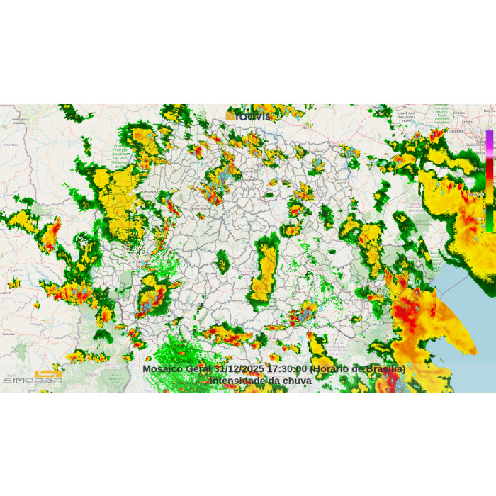 O último dia do ano começou com pancadas de chuva no Sudoeste do estado. Já no período da tarde, pancadas e trovoadas típicas de verão passaram a se formar de maneira irregular em diferentes regiões. As temperaturas máximas estão elevadas em praticamente todo o Paraná, com a faixa Norte e a região Litorânea já registrando valores acima de 30 °C. A combinação do calor intenso com a elevada disponibilidade de umidade na atmosfera favoreceu a formação de tempestades típicas de verão. A estação de Curitiba registrou, até o momento, acumulado de 10,8 mm de precipitação.