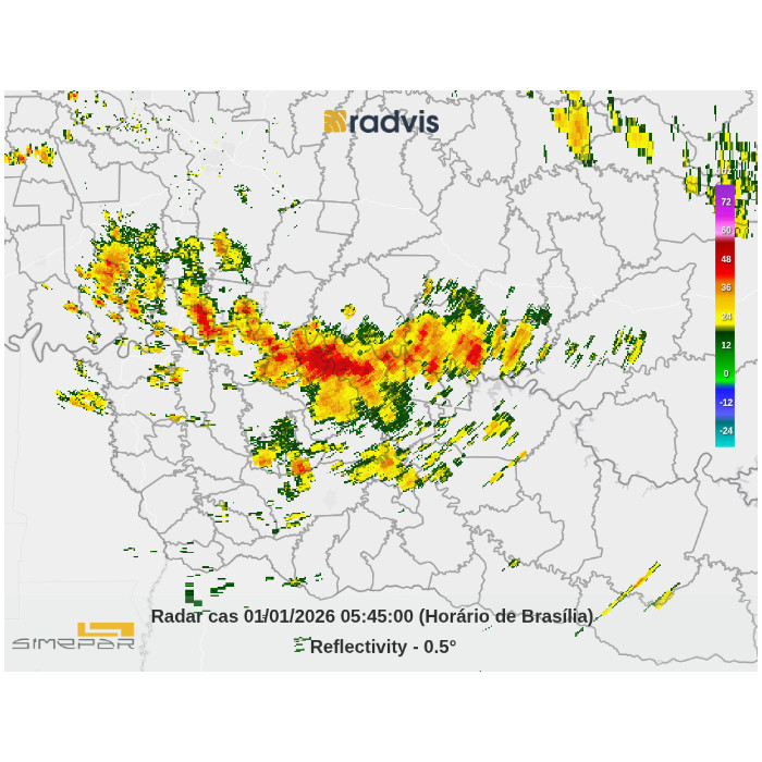 A imagem do mosaico de radares do Simepar mostra o comportamento das áreas de instabilidade que atuam no Paraná neste momento. As chuvas mais intensas acompanhadas de trovoadas se localizam na Grande Curitiba, sudoeste, fronteira com a Argentina, Campos Gerais e na faixa norte paranaense. O tempo instável vai perdurar até a noite, pois as taxas que medem a instabilidade da troposfera estão elevadas. Precipitações elevadas foram registradas em Cruzeiro do Iguaçu, 46,0 mm, Francisco Beltrão, 29,8 mm, Campo Mourão, 27,6 mm, Entre Rios (distrito de Guarapuava), 26,8 mm, Telêmaco Borba, 25,4 mm e Pinhão, 21,4 mm.