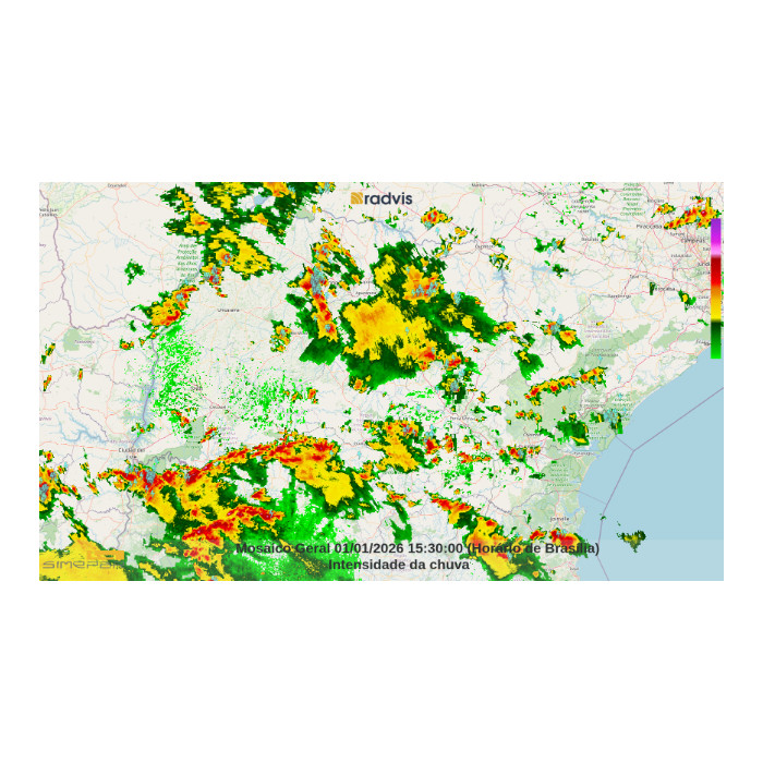 Neste início da madrugada, ainda há ocorrência de pancadas de chuva isoladas, distribuídas de maneira irregular pelas regiões do estado, com fraca intensidade e pouquíssima incidência de raios. Ao longo do período, não estão descartadas novas pancadas de chuva isoladas e de fraca intensidade no Litoral.