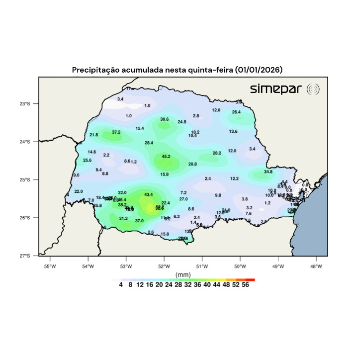 A virada do ano de 2025 para 2026 será marcada pela presença de chuva nas áreas próximas à divisa com Santa Catarina e na metade leste do Paraná. Essas instabilidades ocorrem na forma de pancadas de chuva isoladas, com núcleos de intensidade moderada a forte e eventuais descargas elétricas. No setor sul do Litoral Paranaense, há registro de chuva fraca, com tendência de deslocamento para o setor norte do Litoral.