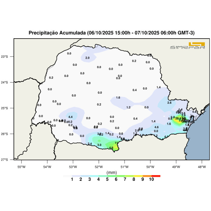 Ao longo da madrugada e neste início de manhã, foram registradas chuvas de intensidades fracas a moderadas e em alguns momentos acompanhadas de algumas descargas elétricas na faixa central do estado, desde o oeste até o leste. O amanhecer foi frio nas regiões Sul, Campos Gerais e RMC, onde os termômetros ficaram abaixo dos 10 ºC, com destaque para Palmas que registrou 6,6 ºC. O mapa mostra os acumulados de chuva registrados pelas redes de estações meteorológicas do Simepar e Inmet, até 07h.