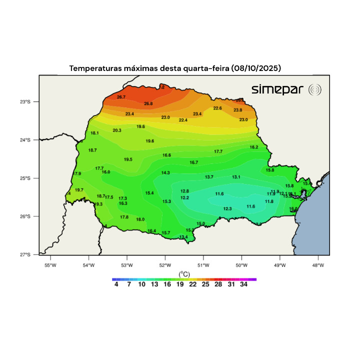 Nesta quarta-feira, apenas na faixa norte do Paraná as temperaturas máximas ultrapassaram os 20,0 °C — condição que pode ser observada na imagem a seguir. Em Paranavaí, por exemplo, foi registrada a maior temperatura do dia, com 26,8 °C. Nas demais regiões do estado, as máximas permaneceram abaixo deste valor. Entre os Campos Gerais e a RMC, os termômetros não passaram dos 16,0 °C.