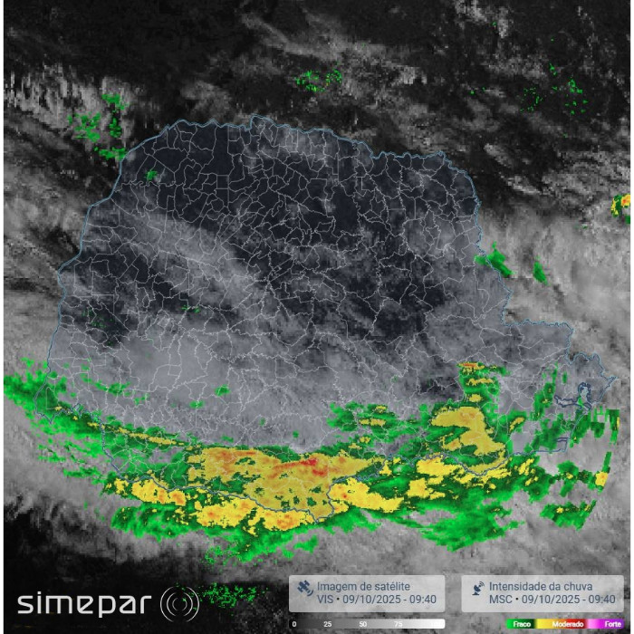 O deslocamento de uma frente fria pelo oceano na altura do Sul do país, mantém o tempo instável nas diversas regiões paranaenses. No decorrer da madrugada, foram registradas chuvas fracas a moderadas entre as regiões dos Campos Gerais e o leste do estado. Neste começo de manhã, pancadas de chuvas acompanhadas de algumas descargas elétricas, são registradas entre as regiões noroeste, central, Campos Gerais, norte e o leste. O destaque do amanhecer foi a queda nas temperaturas, no sul do estado, os termômetros ficaram em torno dos 10 ºC, em Curitiba foi registrado 14 ºC. A imagem dos radares do Simepar, mostra as áreas de chuva que atuam neste momento sobre o Paraná.